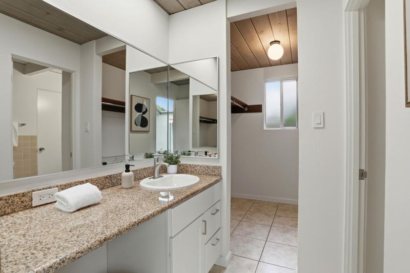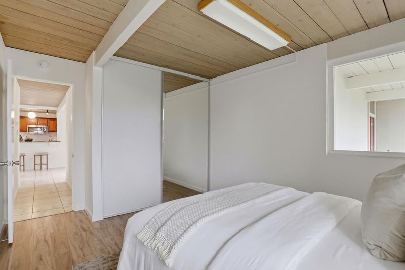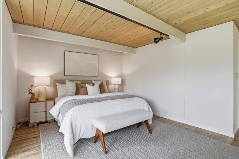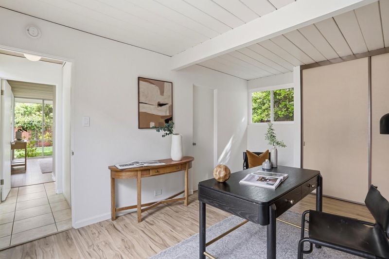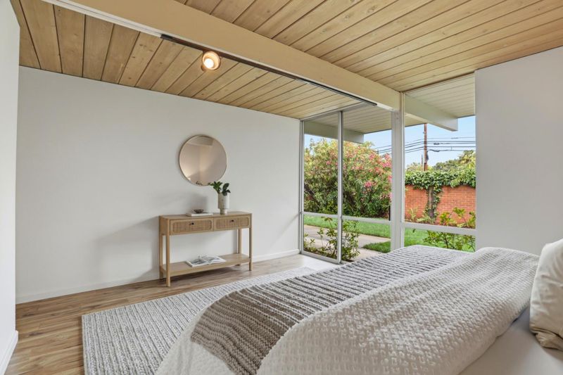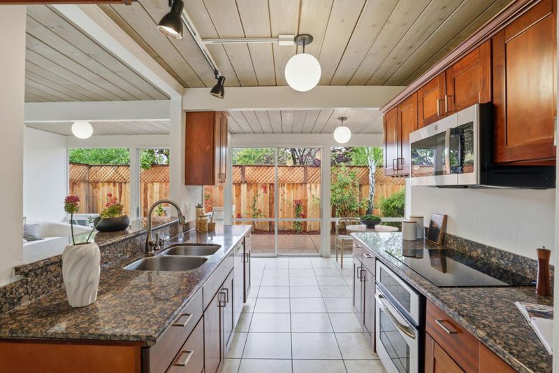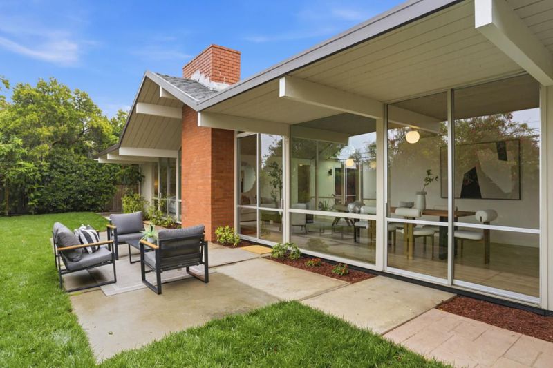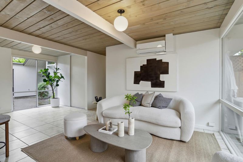 Large Atrium Eichler - Walking Distance Cupertino Schools Rare 2,333 sq ft A-frame atrium Eichler showcasing mid-century architecture with refined updates. Enter through a dramatic open-air tiled atrium, creating seamless indoor-outdoor California living. Light-filled interior with vaulted open-beam ceilings, skylights, and expansive custom double-glazed glass. Kitchen features granite, cherry-stained cabinetry, GE Profile induction cooktop, walk-in pantry, dining nook, and terrace access. Spacious living and dining areas are anchored by a striking floor-to-ceiling fireplace. Separate family room plus indoor laundry/hobby room off kitchen. Flexible 5-bedroom floorplan with two private wings: 3 bedrooms on one side and 2 on the other. Fifth bedroom opens to the atrium, ideal for guest suite, office, studio, or multigenerational living. Bathrooms offer updated vanities, fixtures, and granite counters. Classic Eichler details include radiant heated floors, original wood ceilings, globe lighting, with an added heat pump HVAC. Beautifully landscaped grounds with mature trees and new lawns. Cupertino schools: West Valley Elementary School, Cupertino Middle School, and Homestead High School. Prime Silicon Valley location near shopping, dining, parks, and major tech campuses.