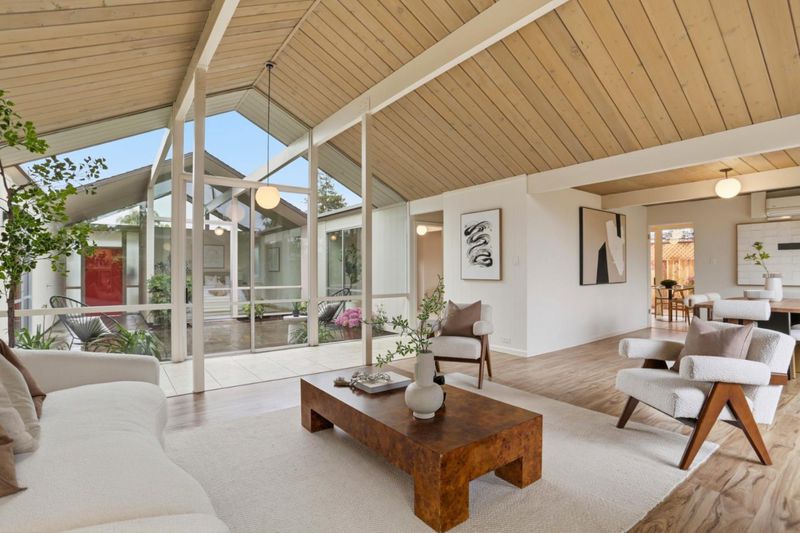Large Atrium Eichler | Cupertino Schools Rare 2,333 sq ft A-frame atrium Eichler mid-century design & modern updates. Enter through a dramatic open-air atrium ideal indoor-outdoor living into a light-filled interior w/ vaulted open-beam ceilings,.